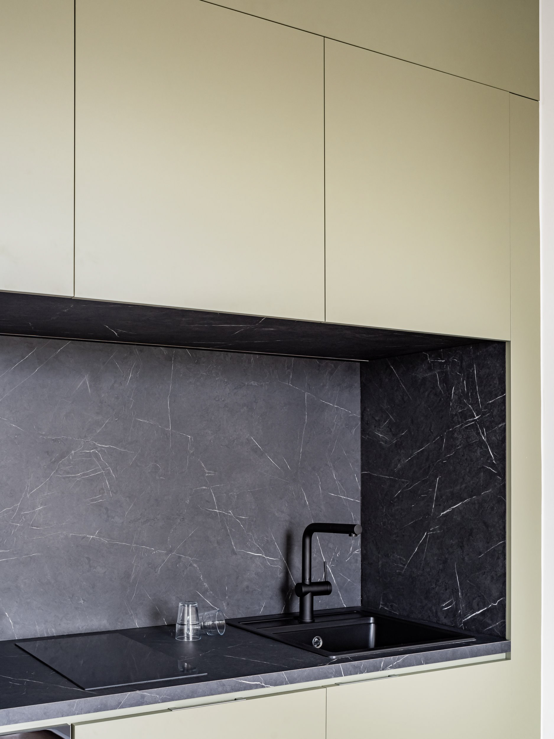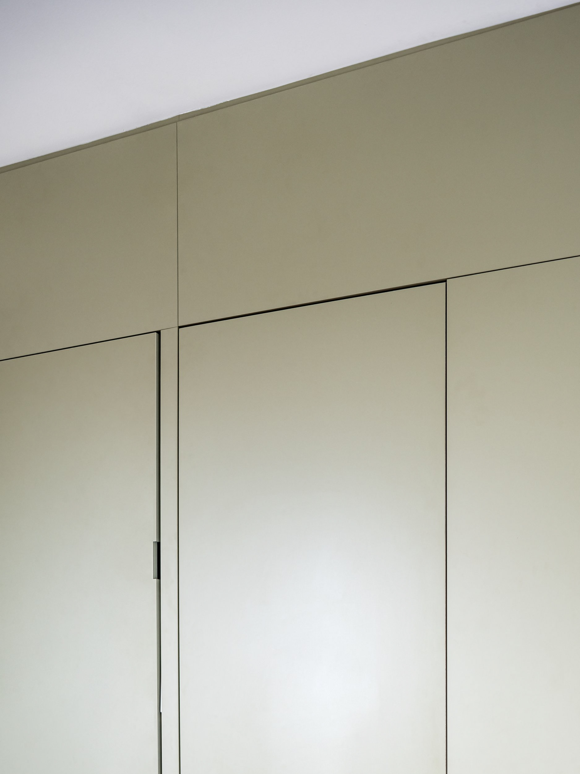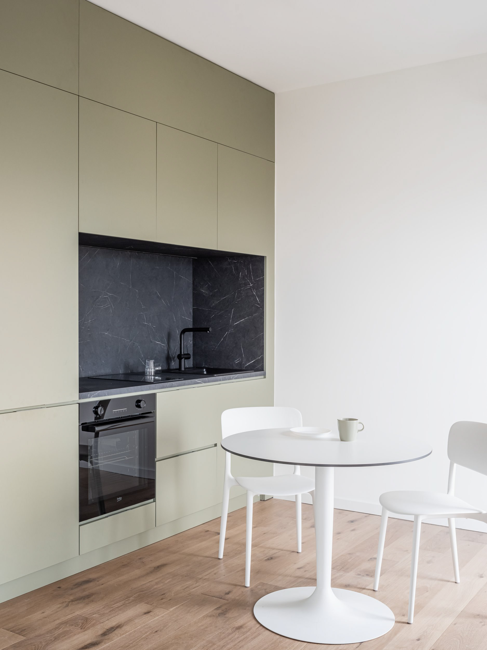 Material choices also play a defining role in this unit. Oak, white surfaces, and sage-green tones create a calm yet distinctive atmosphere, combining simplicity with a clear architectural identity.
