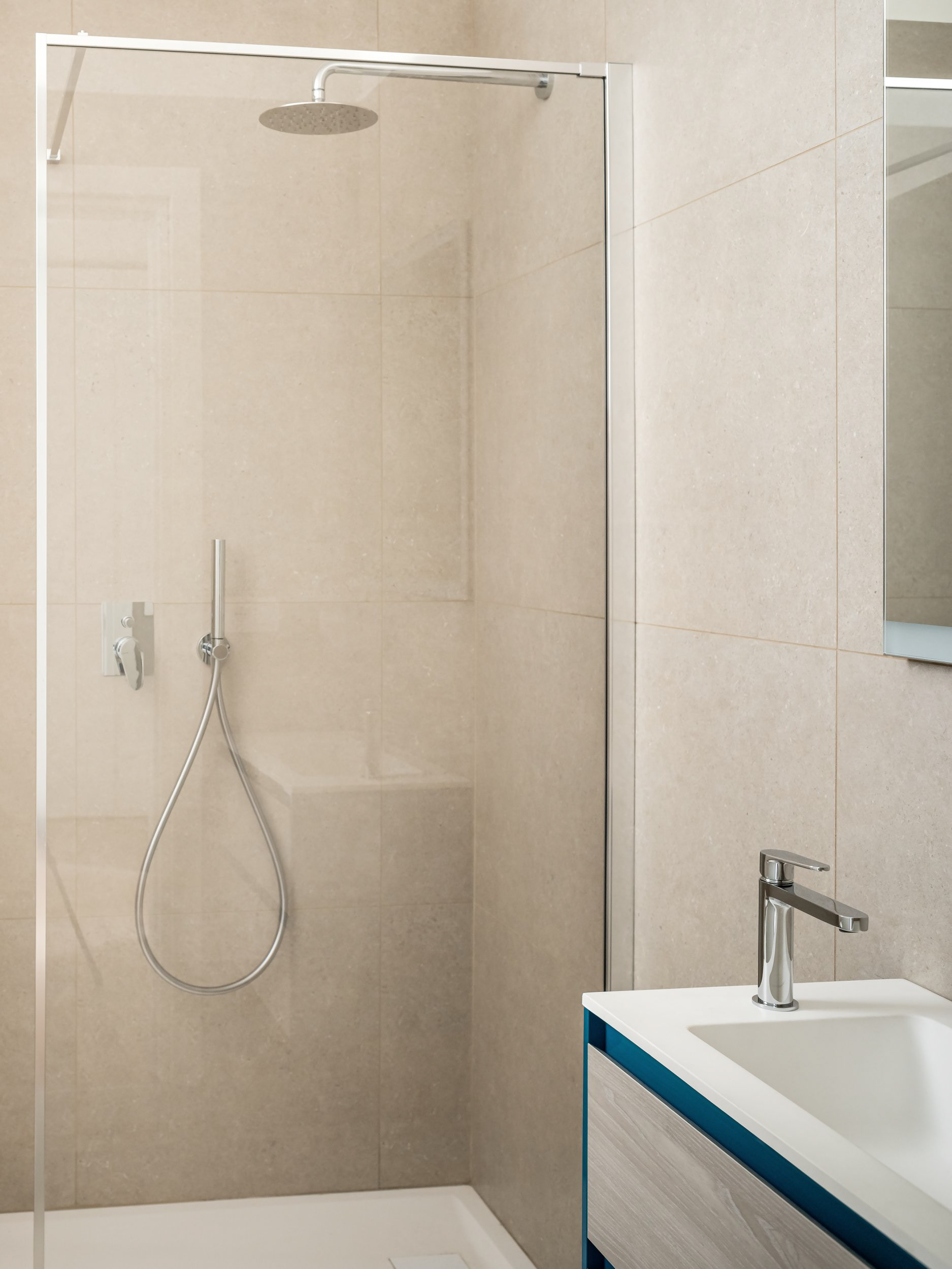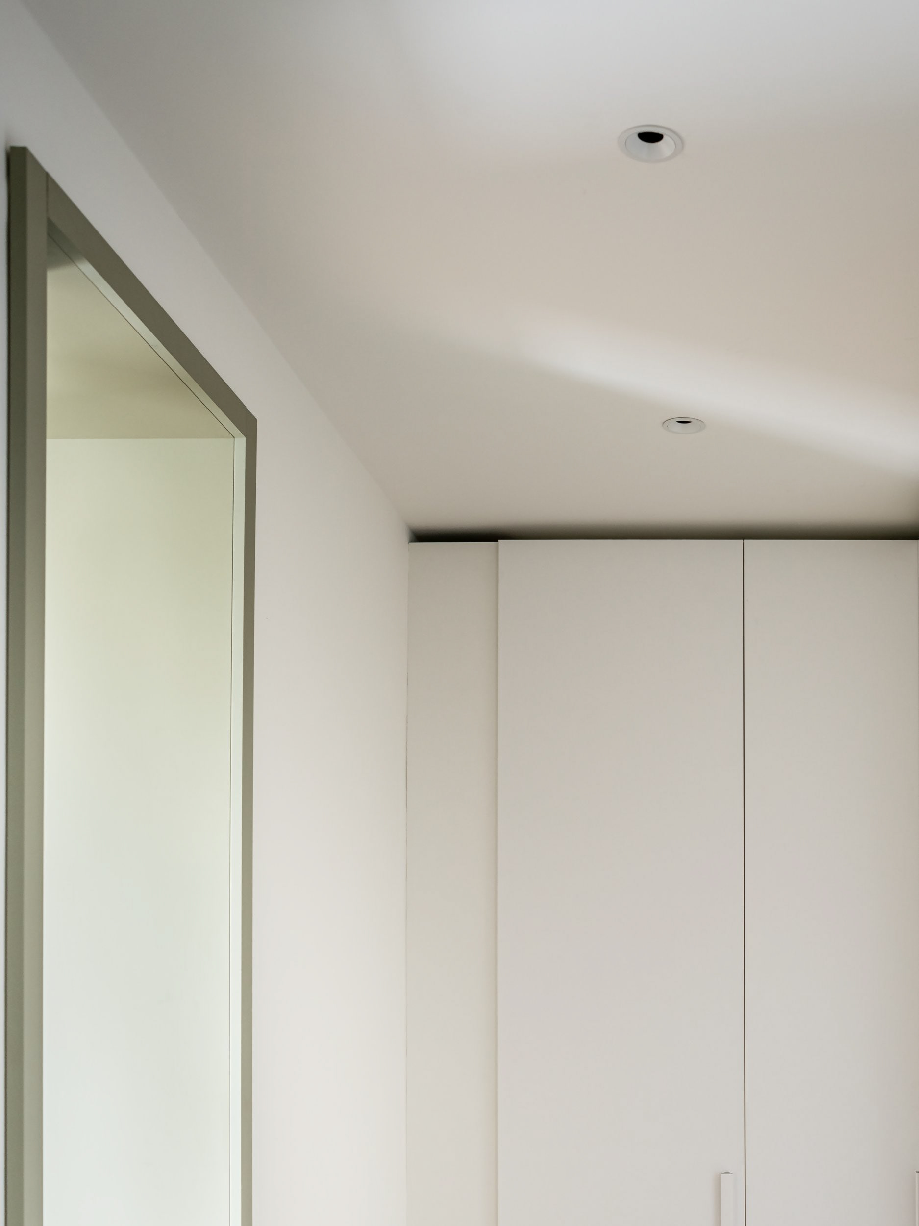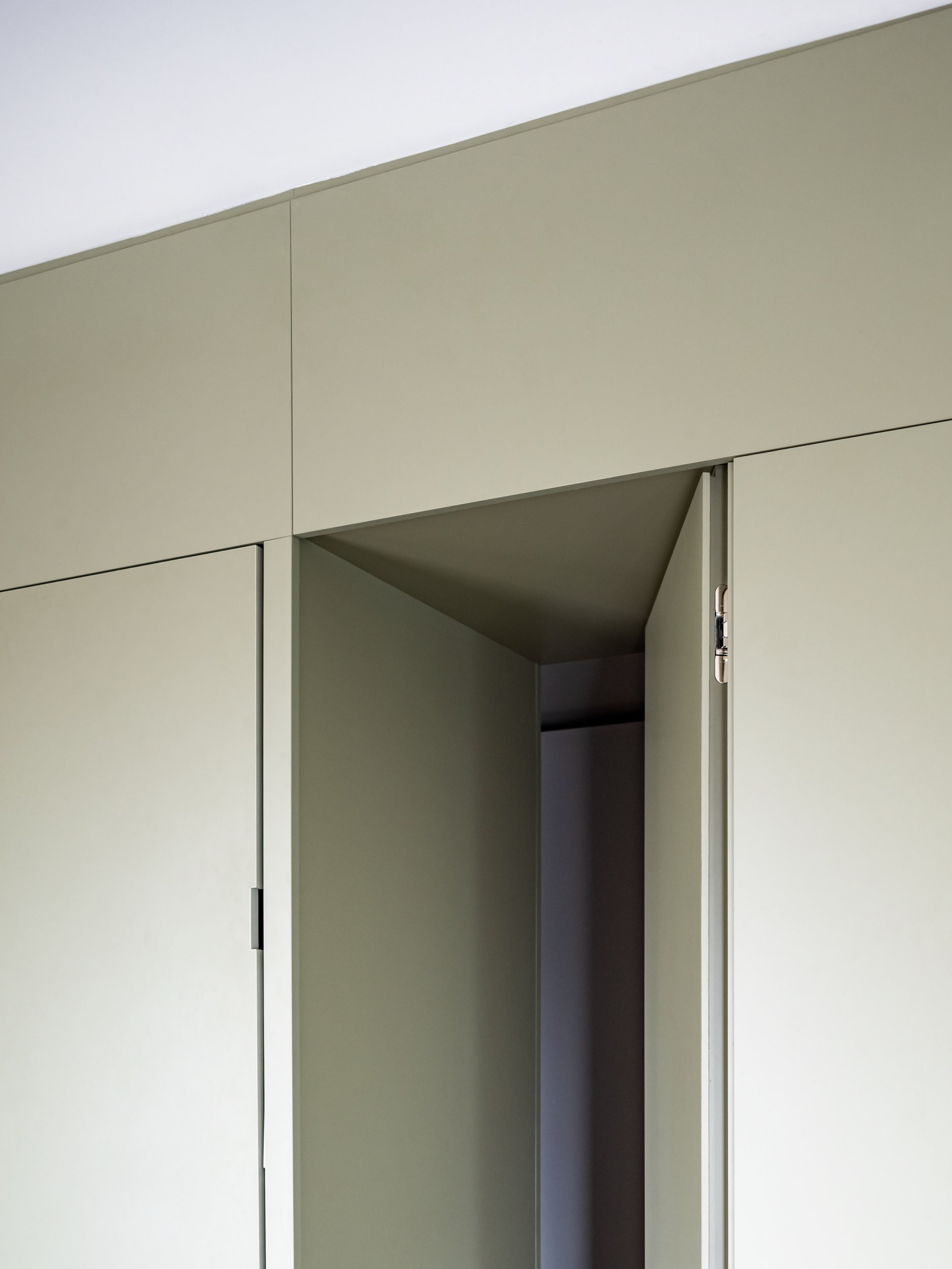 The core of the project is a custom-built storage wall that organizes the entire layout: on one side it structures the main living space, while on the other it separates the service areas, articulated through a multifunctional passage integrating laundry and walk-in closet functions and leading to the bathroom.