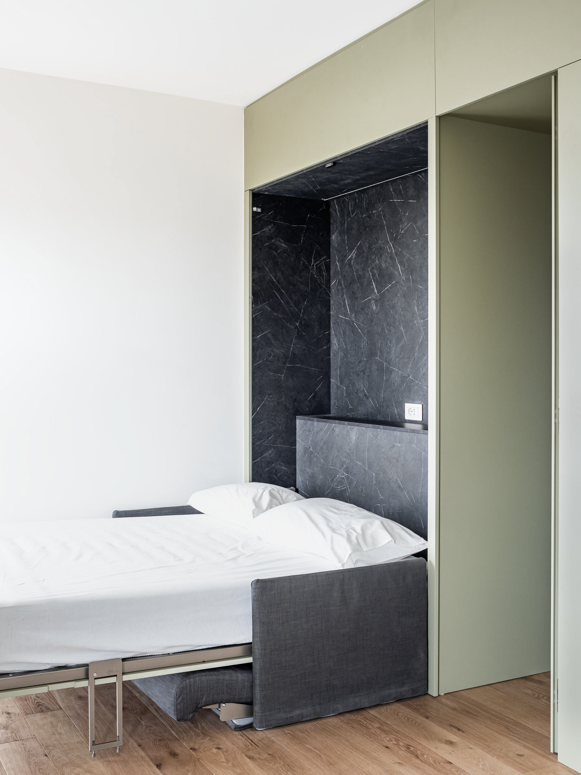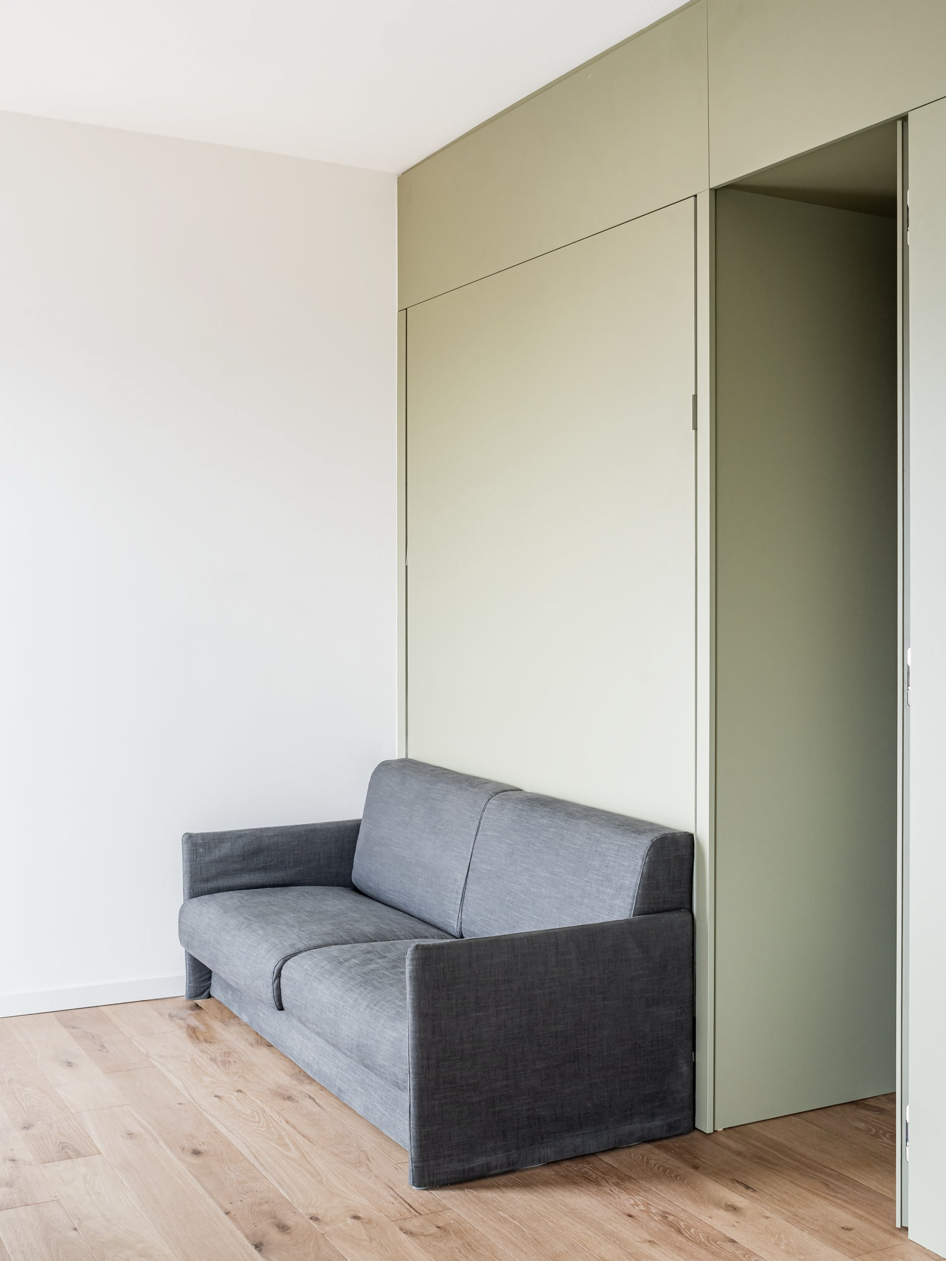 A single, generous space accommodates both the living area and the kitchen, while the sleeping area is designed as a concealed, retractable element, allowing flexibility and spatial continuity.