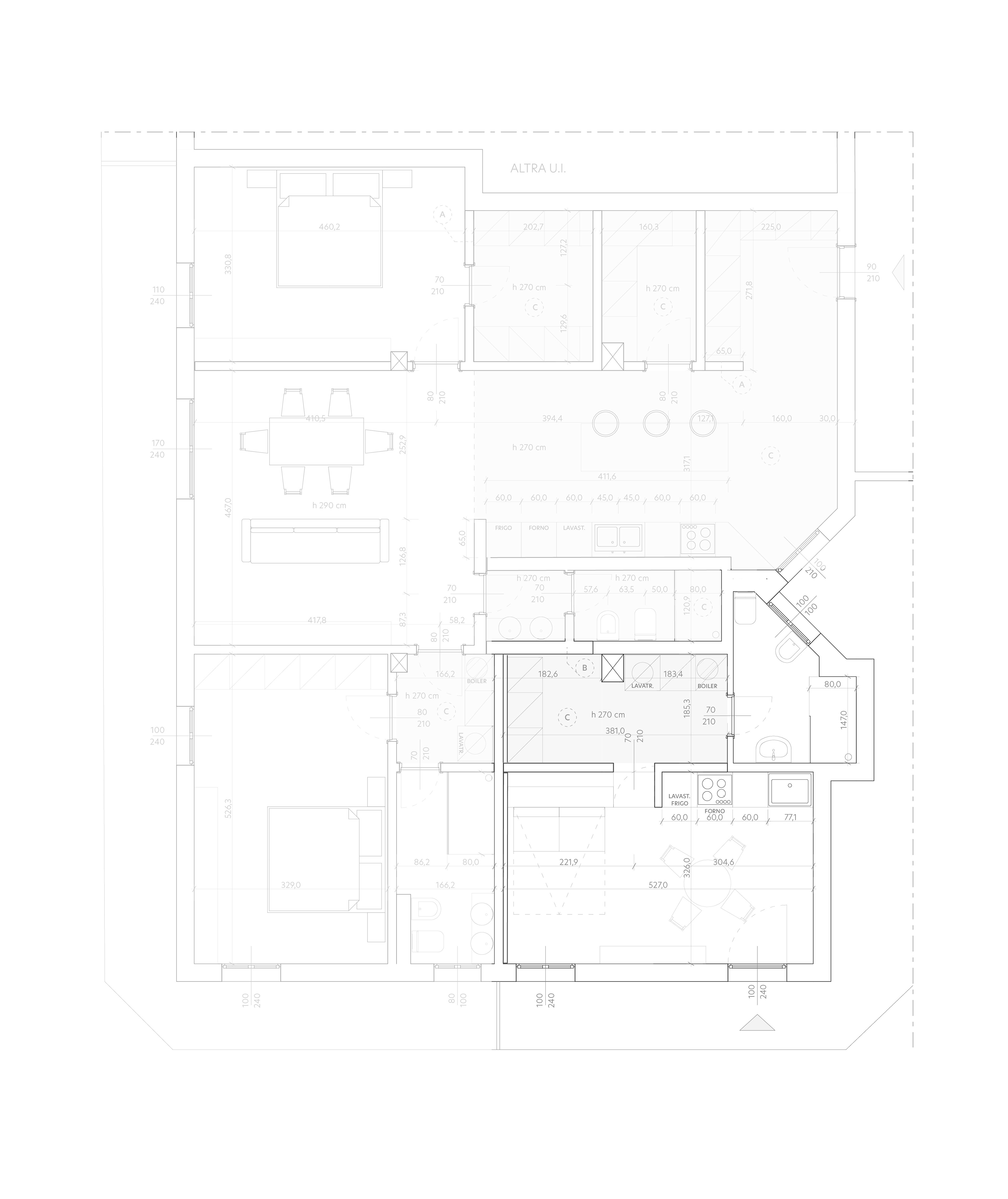 The studio flat, provided with a new independent entrance, is conceived as a compact, essential, and rational living solution.